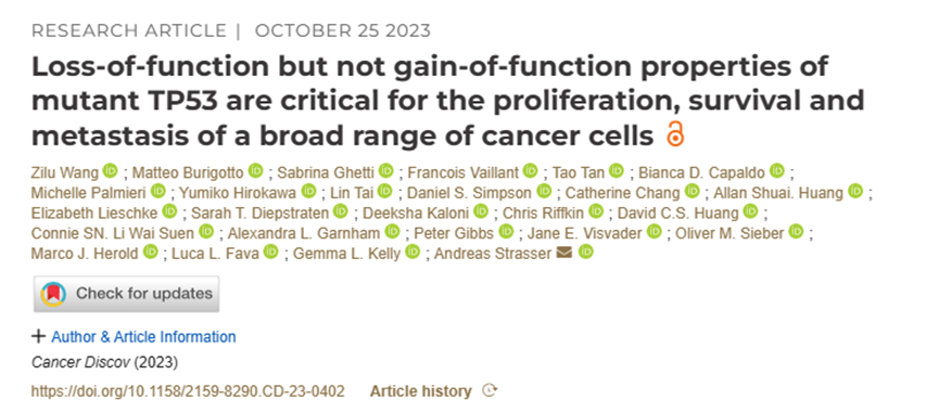 近日,来自WEHI(澳大利亚墨尔本)和Trento大学(意大利)的研究人员的研究人员在Cancer Discovery上发表了相关研究,论文题为Loss-of-function but not gain-of-function properties of mutant TP53 are critical for the proliferation, survival and metastasis of a broad range of cancer cells。该研究首次揭示了突变p53蛋白的哪些特征对推动癌症生长至关重要,这一发现将有助于重新思考治疗具有p53突变的癌症的方法,从而在未来带来新的和改进的癌症治疗方法。