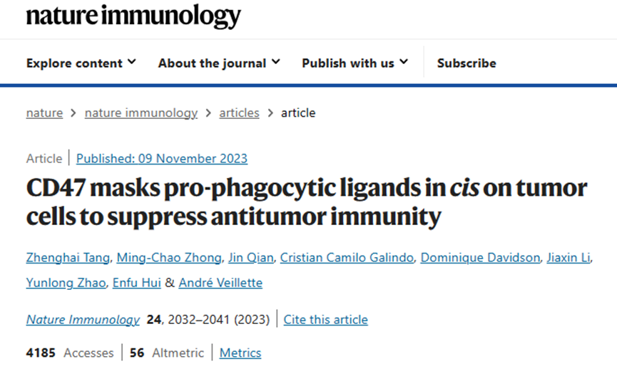 11月9日,来自加拿大蒙特利尔临床研究所的André Veillette研究组发表了相关研究,以CD47 masks pro-phagocytic ligands in cis on tumor cells to suppress antitumor immunity题,发表在Nature Immunology。该论文的科学家们通过研究发现,CD47不仅能通过与SIRPα结合来抑制吞噬作用,还能通过在肿瘤细胞上掩盖细胞固有的促吞噬配体来抑制吞噬作用,了解这一机制可能会影响出于治疗目的而阻断CD47还是阻断SIRPα的决定。