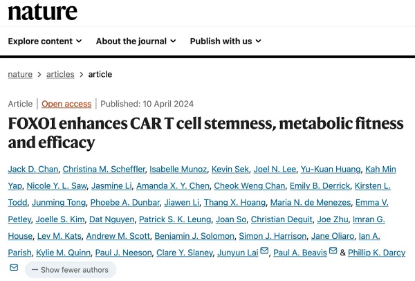 第二篇论文来自墨尔本大学的研究团队,论文题为:FOXO1 enhances CAR T cell stemness, metabolic fitness and efficacy。