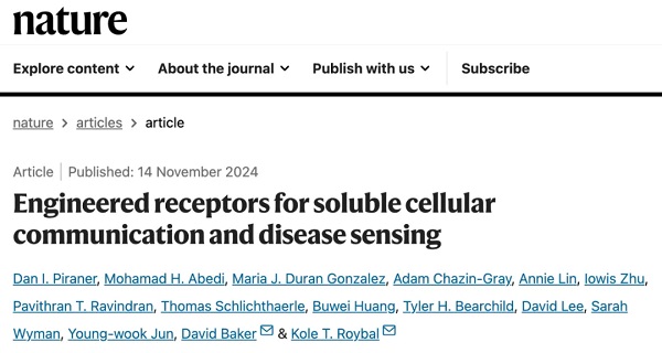 2024年11月14日,David Baker 团队与加州大学旧金山分校 Kole T. Roybal 团队合作,在 Nature 期刊发表了题为:Engineered receptors for soluble cellular communication and disease sensing 的研究论文【1】。