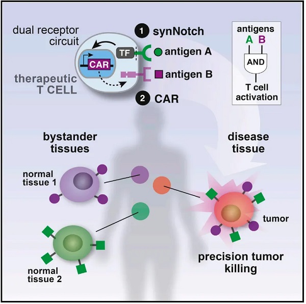 早在2016年,Kole T. Roybal 曾作为第一作者在 Cell 期刊发表论文【2】,开发了一种新型传感器——synNotch受体,将该受体整合到T细胞表面,能够识别肿瘤细胞并激活免疫反应。但这种工程化受体只能识别肿瘤细胞表面的配体,依赖于细胞之间紧密的物理接触来发挥作用。