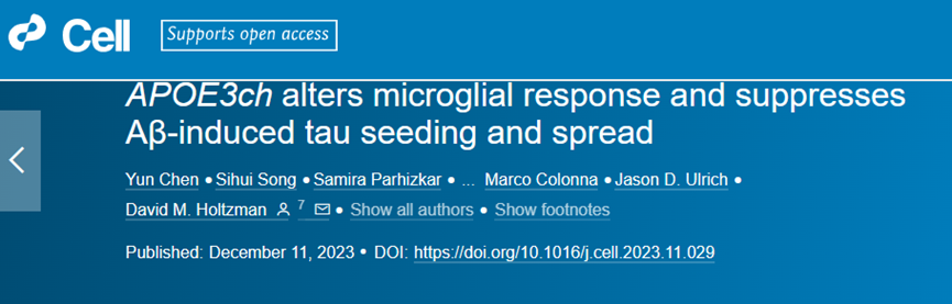 12月11日,来自美国华盛顿大学医学院的研究人员发表了相关研究,研究结果在线发表在Cell 期刊上,论文标题为“APOE3ch alters microglial response and suppresses Aβ-induced tau seeding and spread”。研究人员利用转基因小鼠表明,APOE3ch突变切断了阿尔茨海默病早期阶段(大脑中淀粉样蛋白积聚)和晚期(tau蛋白积累,认知能力开始下降)之间的联系。