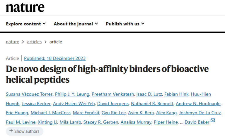 12月18日,华盛顿大学医学院蛋白质设计研究所的科学家们,在《自然》杂志上发表了一项AI驱动生物技术进步的新研究,以De novo design of high-affinity binders of bioactive helical peptides为题。该团队使用AI软件创建蛋白质分子,它们以极高的亲和力和特异性与各种具有挑战性的生物标志物(包括人类激素在内)结合。值得注意的是,科学家们用计算机生成的生物分子与其目标之间实现了有史以来最高的相互作用强度。