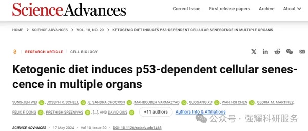 近日,来自美国德克萨斯大学圣安东尼奥健康科学中心的研究人员在Science Advances上发表了相关研究,以“Ketogenic diet induces p53-dependent cellular senescence in multiple organs“为题。研究发现长期生酮饮食会诱导多个器官(包括心脏和肾脏)的细胞衰老,而这种作用是通过单磷酸腺苷激活的蛋白激酶(AMPK)和caspase-2导致的MDM2的失活,导致p53积累和p21产生,进一步诱导细胞衰老的发生。好消息是,通过间歇性KD后,细胞衰老减轻。