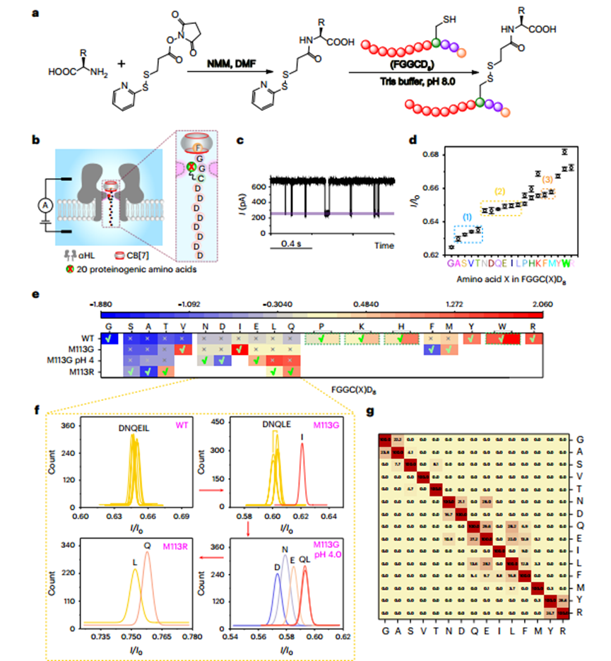他们将20种氨基酸通过偶联反应分别连接到N端为苯丙氨酸、C端为8个天冬氨酸的FGGCD8多肽探针上,并通过WT α-溶血素纳米孔进行分析。虽然偶联后αHL纳米孔对20种氨基酸的分辨率略有下降,但通过利用不同的突变蛋白纳米孔,依然对全部20种氨基酸实现了有效的区分。