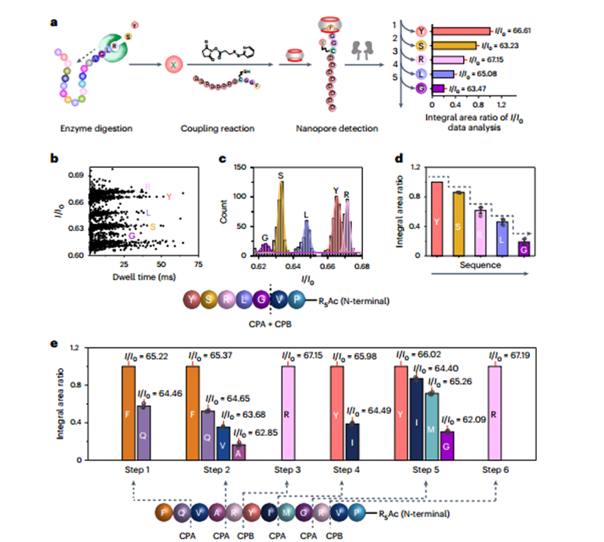 11月13日,中国科学院化学研究所吴海臣研究员和高能物理研究所刘蕾副研究员等在Nature Methods期刊发表了题为:Peptide sequencing based on host–guest interaction-assisted nanopore sensing的研究论文。该研究发现,N端为苯丙氨酸的多肽与胍环分子结合后,多肽穿过α-溶血素纳米孔的阻滞时间增加,使其对特定位点的氨基酸具有极高的分辨率,可对20种氨基酸进行有效区分。在此基础上,研究者通过使用羧肽酶切割目标多肽中的氨基酸,偶联到多肽探针上,成功实现了基于纳米孔技术的多肽序列测定。