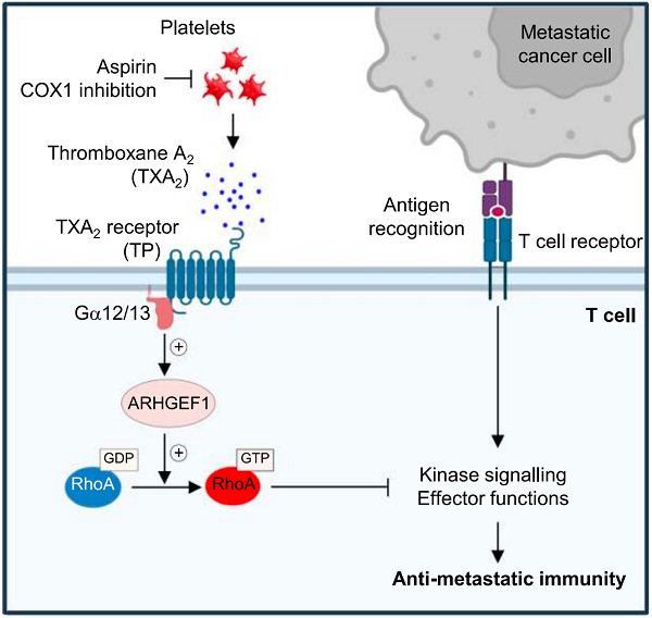 从机制上来说,血小板释放的 TXA2 通过其受体(TP)激活 ARHGEF1,抑制 T 细胞受体(TCR)信号通路,从而削弱了 T 细胞活化及其抗肿瘤免疫功能。而阿斯匹林能够不可逆地抑制 COX-1,从而减少血小板生成 TXA2,TXA2 水平的降低解除了通过 ARHGEF1 对 T 细胞的抑制,进而增强了 T 细胞对抗癌症转移的能力。