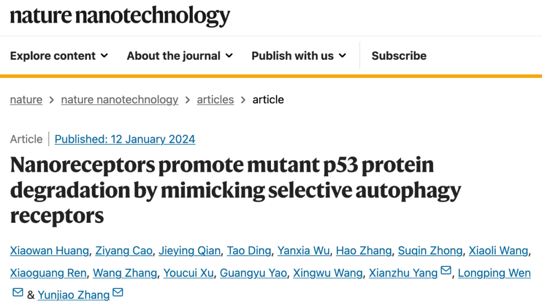 华南理工大学张云娇教授、杨显珠教授及南方医科大学温龙平教授等人在 Nature 子刊 Nature Nanotechnology 上发表了题为:Nanoreceptors promote mutant p53 protein degradation by mimicking selective autophagy receptors 的研究论文。