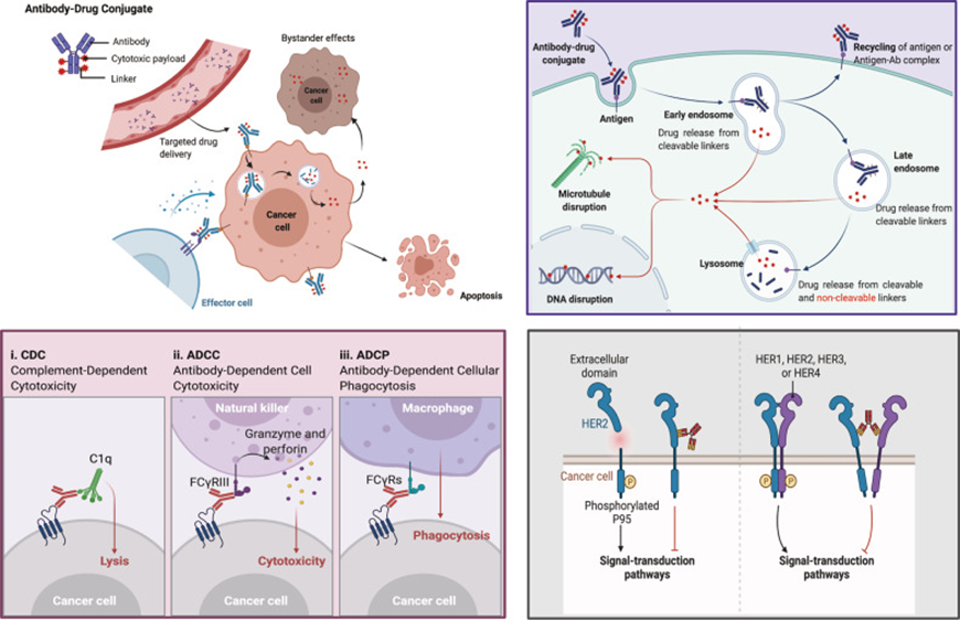 (右上:ADC的主要核心作用机制;左下:ADC的抗体成分与免疫效应细胞结合,引发抗肿瘤免疫,包括补体依赖性细胞毒性(CDC)、抗体依赖性细胞介导的细胞毒性(ADCC)和抗体依赖性吞噬作用(ADCP);右下:ADC的抗体成分保持其活性,因此可以干扰靶功能,抑制下游信号以抑制肿瘤生长。)