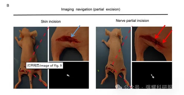 研究人员在PNI小鼠模型中使用GAP-43Ra-ICG-PEG探针进行手术导航,以验证其临床适用性。结果显示,仅通过肉眼进行“完全”切除容易遗漏一些微小病变。在对神经切除切缘的分析中,在神经残端发现了一些残留的肿瘤细胞。60%小鼠在神经切除边缘没有残余肿瘤细胞。