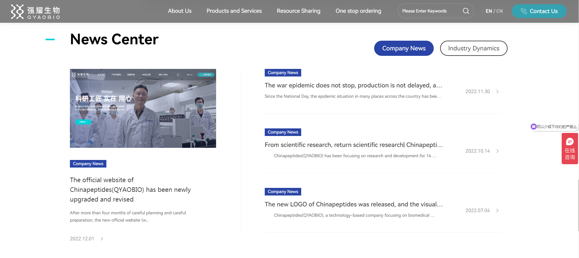 QYAOBIO(ChinaPeptides) has been focusing on peptide synthesis, protein expression and antibody preparation for many years, adhering to the route of scientific research craftsmen, and is committed to providing customers with real scientific research service solutions with high-quality products, professional technology and intimate services to help biomedical scientific research. Now, the new official website of QYAOBIO(ChinaPeptides) has been revised, which will bring customers a better and better service experience while ensuring product quality as always.