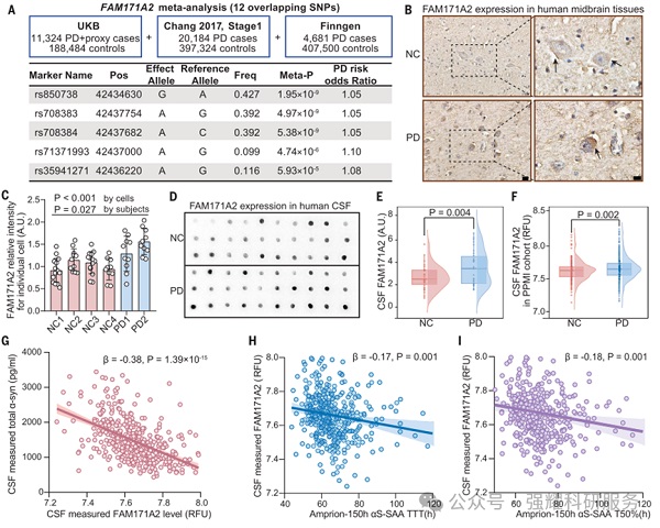 通过对帕金森病(PD)中脑组织研究,FAM171A2 表达升高与患者的 α-突触核蛋白(α-syn)有病理相关性。