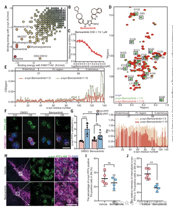 筛选出bemcentinib药物可以有效阻断FAM171A2与α-syn纤维的结合,从而抑制α-syn纤维的内吞和传播,进一步证明FAM171A2作为潜在治疗靶点的重要性。