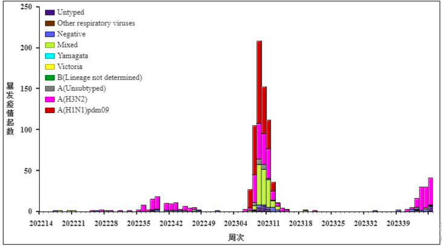 而到了2022年至2023年,我们可以明显地看到,流感样病例在第52周左右,高位上升至顶峰趋势,到了后期又出现一个小高峰。高峰在反反复复的出现,也可以解释我国为何在疫情后存在多个甲流高峰。