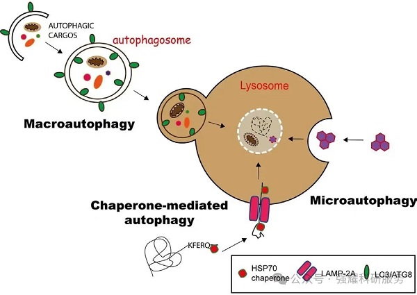 🔹介导自噬(Chaperone-mediated autophagy,CMA):具有KEFRQ样基序的蛋白在HSP70伴侣的帮助下,通过LAMP-2A转运体转运到溶酶体。