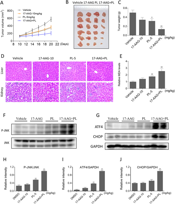 最后,研究人员探究了PL和17-AAG联合使用对体内肿瘤生长的影响。结果显示,联合使用比单独治疗更能减少肿瘤生长,联合治疗未引起任何显著毒性;丙二醛MDA水平明显升高(氧化应激标志物),JNK磷酸化以及ATF4和CHOP的表达增加。这些结果表明17-AAG和PL的联合使用是一种有前景的结肠癌治疗方法。
