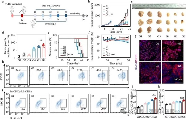 (2)ICD 诱导:TMP+TCO-Dox 组的 HMGB1 释放、CRT 膜暴露、胞外 ATP 水平显著高于对照组(分别提升 6.9 倍、13.3 倍,图 4i-l);
