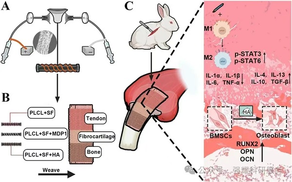 本研究开发了一种新型多功能编织纳米纤维支架,通过整合MDP1(一种源自LncRNA MM2P的生物活性肽)和羟基磷灰石(HA),成功模拟天然肌腱-纤维软骨-骨骼界面的复杂结构,并实现高效组织再生。