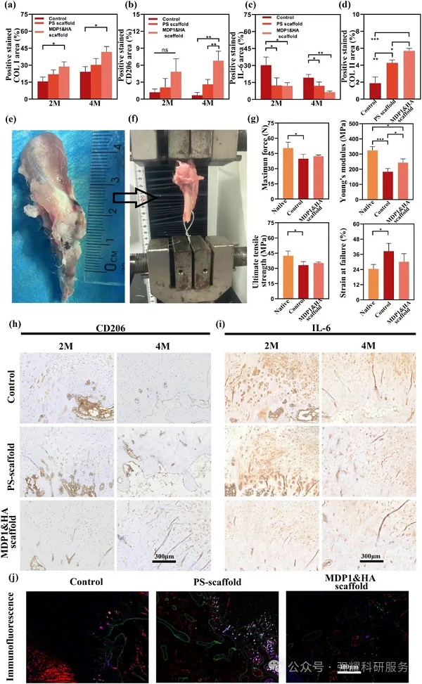 a. 肌腱-骨界面重构:MDP1&HA支架组4个月时可见有序的COL II纤维排列,纤维软骨层与骨组织紧密连接,而对照组仍以瘢痕组织为主。