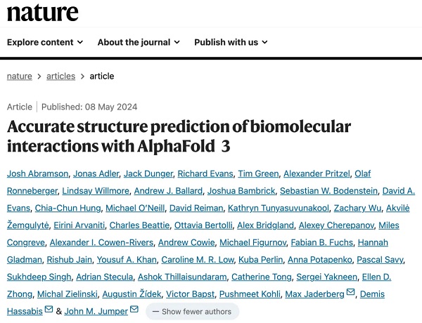 2024年5月9日,DeepMind与Isomorphic Labs的研究人员在 Nature 期刊发表了题为:Accurate structure prediction of biomolecular interactions with AlphaFold 3 的研究论文。