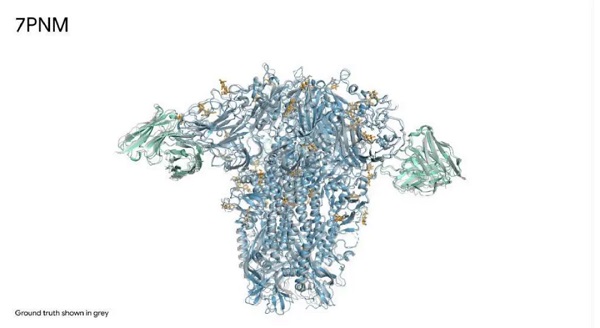 下图展示了AlphaFold3对一种分子复合物的结构预测,该复合物包含一种酶蛋白(蓝色)、离子(黄色球体)和单糖(黄色),预测结果与真实结构(灰色)非常吻合。这种酶存在于一种土壤寄生真菌(大丽轮枝菌)中,会损害多种植物,了解这种酶与植物细胞的相互作用有助于研究人员培育更健康、更具抗性的作物。