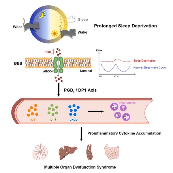 该研究发现,长期睡眠剥夺触发小鼠危及生命的细胞因子风暴,并进一步阐明了背后的机制——睡眠剥夺诱导 PGD2 在大脑内积累,随后 ABCC4 转运蛋白介导的脑源性 PGD2 外排穿过血脑屏障,导致促炎细胞因子的过量产生,最终导致细胞因子风暴样表型和多器官功能障碍综合征(MODS)。