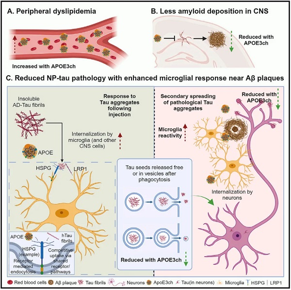 该研究还证明,与较弱的 APOE3ch 结合硫酸肝素蛋白聚糖相关的 τ 聚集物的髓系细胞吞噬和降解增加。APOE3ch 影响小胶质细胞对 Aβ 斑块的反应,从而抑制 Aβ 诱导的 tau 蛋白的形成和播散。这些结果揭示了靶向 Aβ 诱导的 tau 蛋白病的新的可能性。