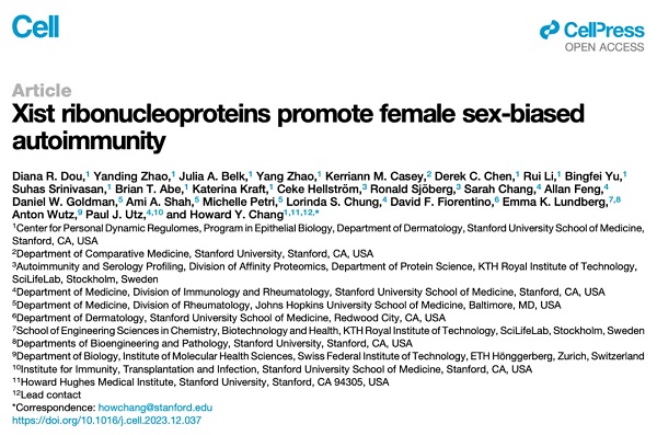 2024年2月1日,斯坦福大学张元豪团队在 Cell 期刊发表了题为:X-ist ribonucleoproteins promote female sex-biased autoimmunity 的研究论文。