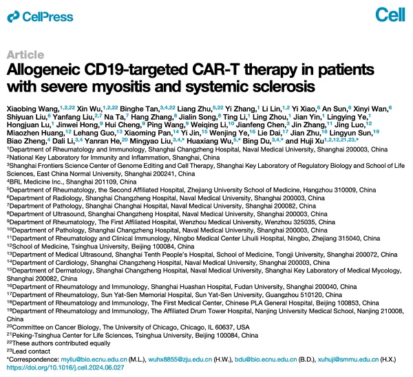 2024年7月16日,邦耀生物联合华东师范大学杜冰、刘明耀及海军军医大学附属长征医院徐沪济等在 Cell 期刊发表了题为:Allogeneic CD19-targeted CAR-T therapy in patients with severe myositis and systemic sclerosis 的研究论文。