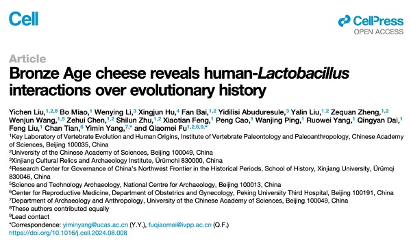 2024年9月25日,中国科学院古脊椎动物与古人类研究所付巧妹团队联合中国科学院大学人文学院杨益民等,在 Cell 期刊发表了题为:Bronze Age cheese reveals human-Lactobacillus interactions over evolutionary history 的研究论文。