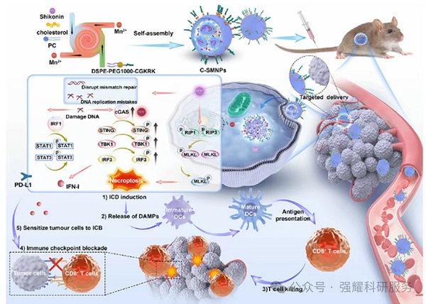研究团队首先设计了一种脂质纳米颗粒C-SNPs。这种颗粒通过CGKRK肽修饰,能够特异性靶向高表达HSPG2的鳞状细胞癌细胞,并成功递送活性成分紫草素(SHK)。紫草素作为一种天然化合物,具有诱导免疫原性细胞死亡(ICD)的能力,但由于溶解性和脱靶效应的问题,其临床应用受到限制。C-SNPs的出现解决了这些问题,显著提高了紫草素的稳定性和靶向递送效率。