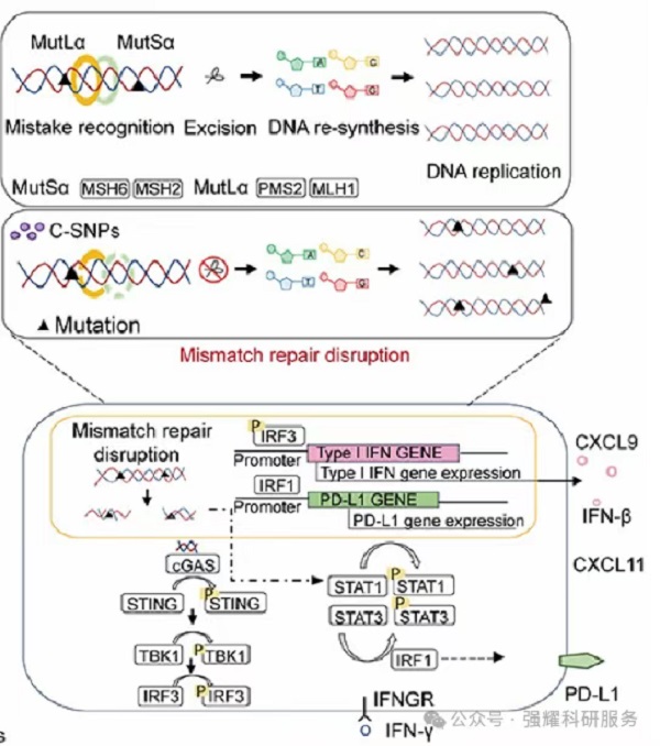实验结果表明,C-SNPs能够在体内外诱导肿瘤细胞发生坏死性凋亡(necroptosis),同时通过下调错配修复(MMR)相关基因和蛋白表达,触发cGAS-STING信号通路,促进I型干扰素(IFN)的释放。这些变化增强了树突状细胞(DCs)和CD8+ T细胞的浸润,进一步激活了抗肿瘤免疫反应。然而,单独使用C-SNPs与抗PD-1抗体联合治疗时,其对肿瘤生长的抑制效果仍然有限。