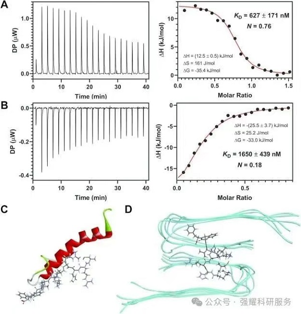 (1)结合游离Aβ单体:通过ITC测定,AuCRHA1与Aβ40单体的解离常数 KD=627±171nM,结合比为3:4,可降低游离单体的有效浓度,抑制初级成核和纤维延伸。AuCRHA1主要通过与游离 Aβ 结合来发挥其抑制作用40单体,从而降低可用于Aβ 的单体的有效浓度40集合体。