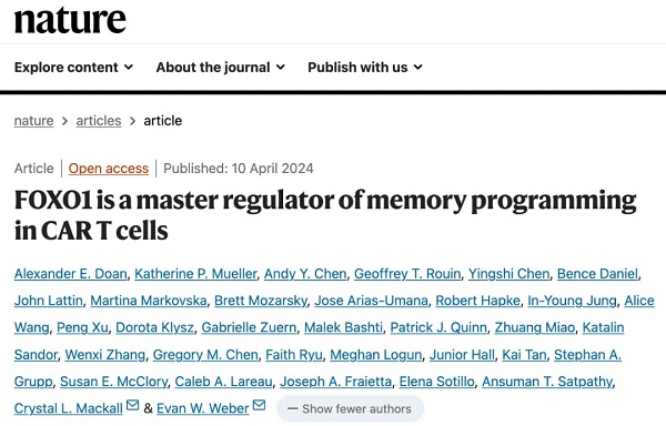 2024年4月10日,Nature 期刊背靠背发表了两篇论文,这两项研究殊途同归,都证实了转录因子FOXO1能够增强CAR-T细胞活力,防止其耗竭,从而增强其抗肿瘤活性。