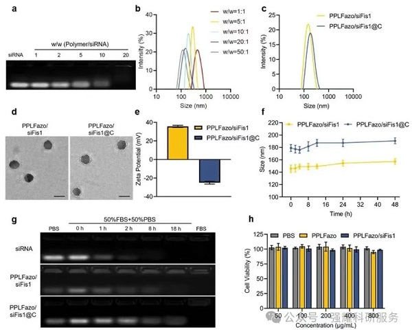 (1)PPLFazo/siFis1@C在血清中48 h稳定,与缺少偶氮苯连接体的PP/siFis 1相比,PPLFazo/siFis 1在低氧环境下4 h显著释放siRNA,且均未表现出显著的细胞毒性。