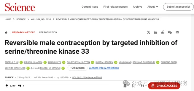5月23日,来自贝勒医学院的研究团队在Science上发表相关研究,题为:Reversible male contraception by targeted inhibition of serine/threonine kinase 33的研究论文。该研究发现了一种靶向丝氨酸/苏氨酸激酶33(STK33)的小分子--CDD-2807,能够成功降低雄性小鼠的生育能力,且未显示任何不良反应。更重要的是,这种疗法的避孕效果是可逆的,小鼠在停止使用不久后就恢复了生育能力。