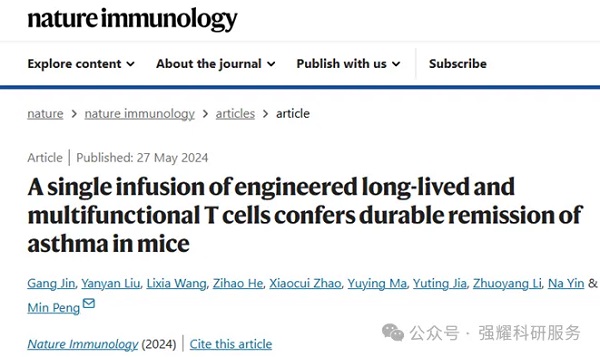 5月27日,清华大学基础医学院的彭敏副教授团队在Nature Immunology杂志发表了相关研究,论文题目为:A single infusion of engineered long-lived and multifunctional T cells confers durable remission of asthma in mice。该研究以IL-5作为靶向结构域,设计了一种长寿命CAR-T细胞,经过基因编辑和改造后得到长效多功能CAR-T细胞--5TIF4细胞。在动物模型中只需单次输注5TIF4细胞,显著缓解肺部炎症,消除哮喘症状,达到治愈效果。该研究首次实现了CAR-T细胞对哮喘这一常见疾病在动物模型中的治愈,开启了细胞疗法治愈常见非肿瘤疾病的新篇章。