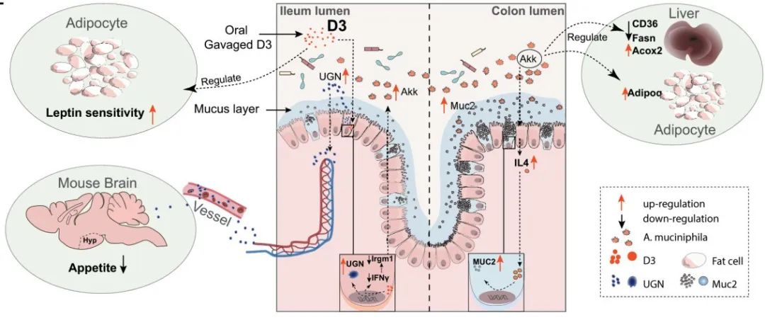 Through the study of the mechanism of action of D3, it was found that after oral administration, D3 was mainly absorbed by intestinal epithelial cells in the small intestine, which significantly promoted the expression of the anorexia hormone UGN, while the activity and expression of POMC expression neurons with antiphasitic effect in the hypothalamus were enhanced and increased, and the food intake of mice was finally reduced. D3 has limited effects on indirect energy metabolism in mice.