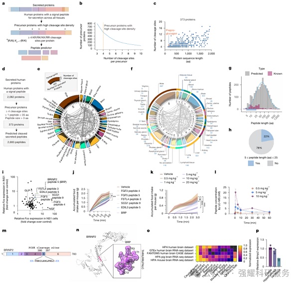 肽类激素由PCSK1/3酶机制生成,在代谢调节中发挥重要作用。尽管GLP-1等已知代谢调节剂的功能已被深入研究,但PCSK1生成的肽谱及其功能角色仍大部分未知。为了填补这一空白,研究者开发了一种名为Peptide Predictor的系统性计算-功能方法,基于PCSK前激素处理过程,识别出了大量进化上保守的肽段,并最终发现了BRP作为一种有效的厌食性肽。