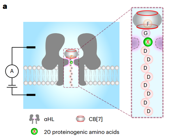 11月13日,中国科学院化学研究所吴海臣研究员和高能物理研究所刘蕾副研究员等在Nature Methods期刊发表了题为:Peptide sequencing based on host–guest interaction-assisted nanopore sensing的研究论文。该研究发现,N端为苯丙氨酸的多肽与胍环分子结合后,多肽穿过α-溶血素纳米孔的阻滞时间增加,使其对特定位点的氨基酸具有极高的分辨率,可对20种氨基酸进行有效区分。在此基础上,研究者通过使用羧肽酶切割目标多肽中的氨基酸,偶联到多肽探针上,成功实现了基于纳米孔技术的多肽序列测定。
