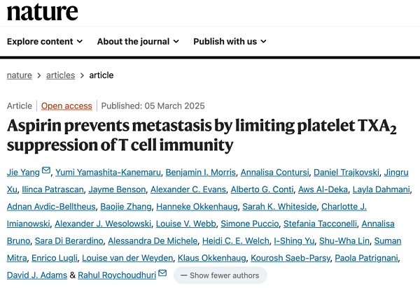 2025 年 3 月 5 日,剑桥大学 Rahul Roychoudhuri 教授、高级博士后研究员 杨杰 等人在国际顶尖学术期刊 Nature 发表了题为:Aspirin prevents metastasis by limiting platelet TXA2 suppression of T cell immunity 的研究论文。