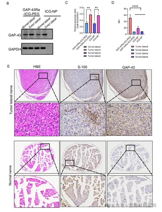 (2)此外,激光共聚焦显微镜最明显的发现是GAP-43Ra-ICG-PEG探针与受侵袭神经的神经元特异性蛋白S-100共定位,具有最强的荧光强度。据体外结果,IHC和WB分析显示GAP-43在肿瘤侵袭的神经中高度表达。