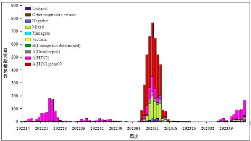 而到了2022年至2023年,我们可以明显地看到,流感样病例在第52周左右,高位上升至顶峰趋势,到了后期又出现一个小高峰。高峰在反反复复的出现,也可以解释我国为何在疫情后存在多个甲流高峰。