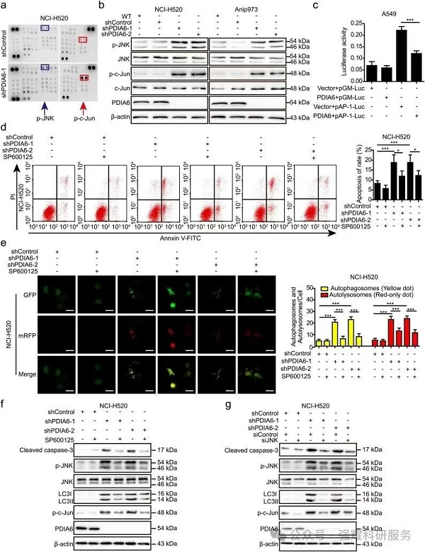 (1)通过蛋白芯片检测可得知,干扰PDIA6通过JNK和c-Jun引起肿瘤细胞的自噬和凋亡,并引起p-JNK和p-c-Jun升高。
