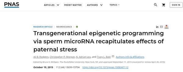 在2015年发表在《美国科学院院刊》的一项研究中,来自宾夕法尼亚大学科学家建立了一种父代压力模型,他们发现一些特殊的microRNA(简称miRs)。当雄性小鼠受到压力时,这些miRs在它们的精子中就会增多。而且,这些增多的miRs竟然与后代的下丘脑-垂体-肾上腺(简称HPA)应激反应减弱有关。