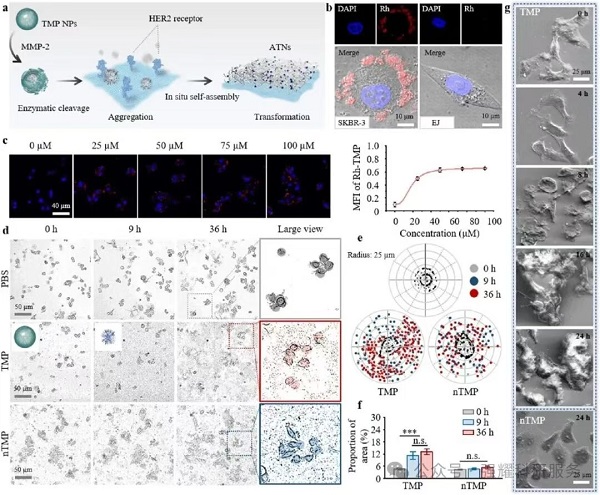 (3)细胞靶向性:TMP 需同时依赖 MMP-2 切割与 HER2 靶向,才能在肿瘤细胞表面原位自组装为 ATNs,具备肿瘤细胞特异性,避免正常细胞干扰(图 3b/c)。