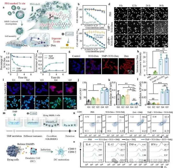 (2)ICD 诱导:TMP+TCO-Dox 组的 HMGB1 释放、CRT 膜暴露、胞外 ATP 水平显著高于对照组(分别提升 6.9 倍、13.3 倍,图 4i-l);