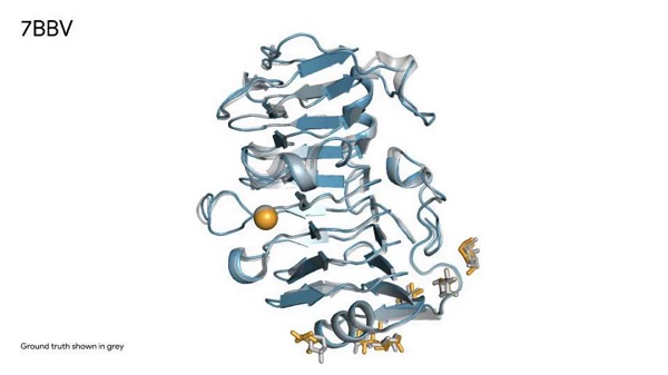 下图展示了AlphaFold3对一种分子复合物的结构预测,该复合物包含一种酶蛋白(蓝色)、离子(黄色球体)和单糖(黄色),预测结果与真实结构(灰色)非常吻合。这种酶存在于一种土壤寄生真菌(大丽轮枝菌)中,会损害多种植物,了解这种酶与植物细胞的相互作用有助于研究人员培育更健康、更具抗性的作物。