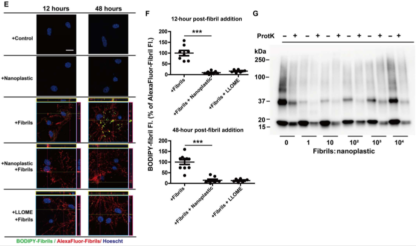 通过使用α-突触核蛋白纤维的BODIPY标记工具来测量溶酶体中α-突触核蛋白的降解,研究人员发现阴离子纳米塑料影响了溶酶体的降解功能,减缓了α-突触核蛋白聚集物的降解速度。