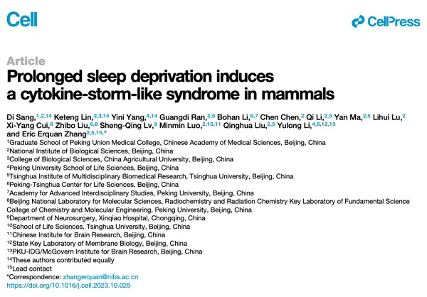 2023年11月27日,北京生命科学研究所/清华大学生物医学交叉研究院张二荃团队在 Cell 期刊发表了题为:Prolonged sleep deprivation induces a cytokine storm-like syndrome in mammals 的研究论文。